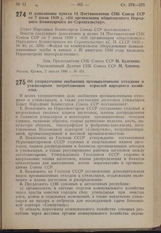 Постановление Совета Народных Комиссаров. О дополнении пункта 14 Постановления СНК Союза ССР от 7 июля 1939 г. «Об организации общесоюзного Народного Комиссариата по Строительству». 2 апреля 1940 г. № 431