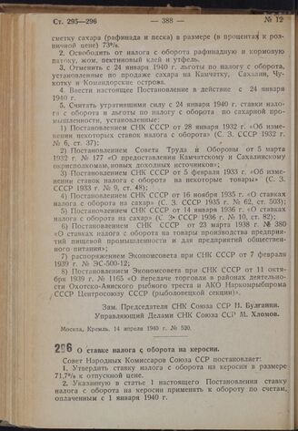 Постановление Совета Народных Комиссаров. О ставке налога с оборота на керосин. 29 апреля 1940 г. № 614