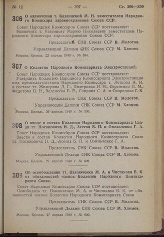 Постановление Совета Народных Комиссаров. О вводе в состав Коллегии Народного Комиссариата Связи тт. Носоновича Н.Д., Асеева Б.П. и Омельченко Г.А. 27 апреля 1940 г. № 602