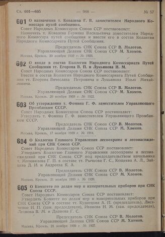 Постановление Совета Народных Комиссаров. Об утверждении т. Фомина Г.Ф. заместителем Управляющего Промбанком СССР. 17 ноября 1939 г. № 1914
