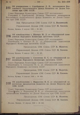 Постановление Совета Народных Комиссаров. Об освобождении т. Маркелова И.Е. от обязанностей заместителя председателя Комитета по Делам Искусств при СНК СССР. 14 апреля 1940 г. № 521