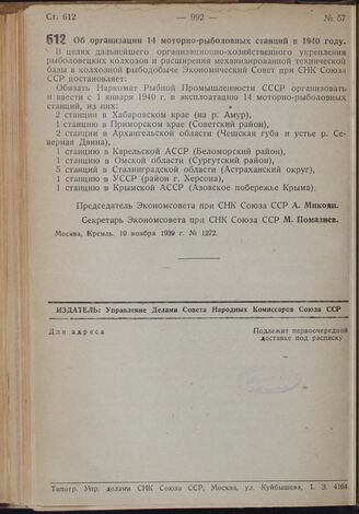 Постановление Экономического Совета при СНК Союза ССР. Об организации 14 моторно-рыболовных станций в 1940 году. 10 ноября 1939 г. № 1272