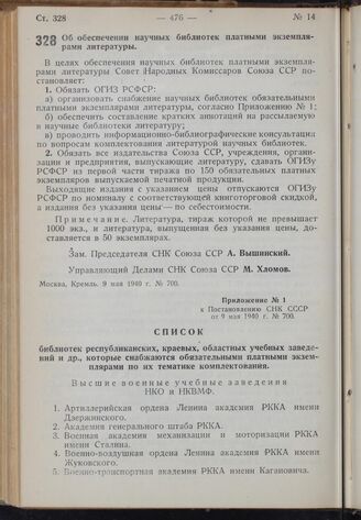 Постановление Совета Народных Комиссаров. Об обеспечении научных библиотек платными экземплярами литературы. 9 мая 1940 г. № 700