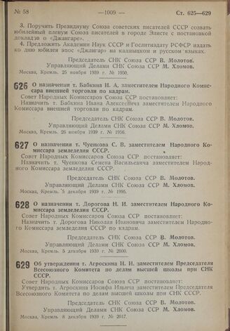 Постановление Совета Народных Комиссаров. О назначении т. Дорогова Н.И. заместителем Народного Комиссара земледелия СССР. 5 декабря 1939 г. № 2000