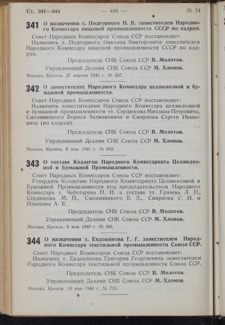 Постановление Совета Народных Комиссаров. О составе Коллегии Народного Комиссариата Целлюлозной и Бумажной Промышленности. 8 мая 1940 г. № 691