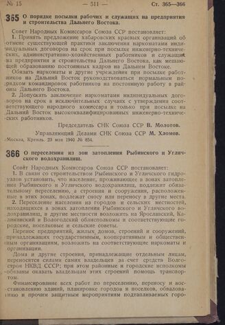 Постановление Совета Народных Комиссаров. О порядке посылки рабочих и служащих на предприятия и строительства Дальнего Востока. 23 мая 1940 № 654