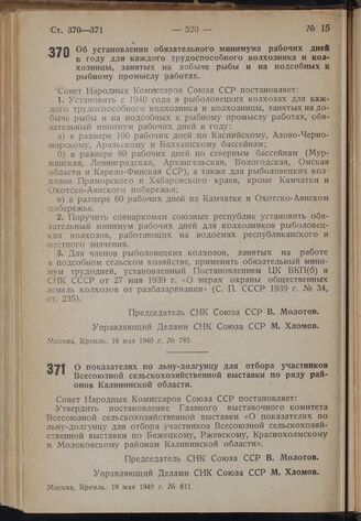 Постановление Совета Народных Комиссаров. О показателях по льну-долгунцу для отбора участников Всесоюзной сельскохозяйственной выставки по ряду районов Калининской области. 19 мая 1940 г. № 811