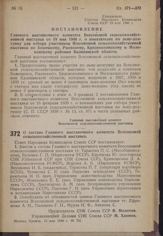 Постановление Совета Народных Комиссаров. О составе Главного выставочного комитета Всесоюзной сельскохозяйственной выставки. 10 мая 1940 г. № 741