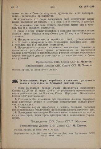 Постановление Совета Народных Комиссаров Союза ССР. О повышении норм выработки и снижении расценок в связи с переходом на 8-часовой рабочий день. 26 июня 1940 г. № 1099