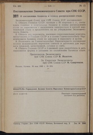 Постановление Экономического Совета при СНК СССР. О составлении балансов и планов распределения стали. 16 мая 1940 г. № 683
