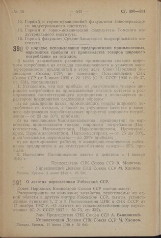 Постановление Совета Народных Комиссаров Союза ССР. О порядке использования предприятиями промышленных наркоматов прибыли от производства товаров широкого потребления из отходов. 2 июня 1940 г. № 934