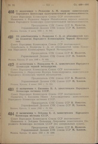 Постановление Совета Народных Комиссаров Союза ССР. Об освобождении т. Воликова С.Д. от обязанностей члена Коллегии Народного Комиссариата Черной Металлургии. 27 мая 1940 г. № 869