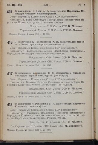 Постановление Совета Народных Комиссаров Союза ССР. О назначении т. Рахманина В.И. заместителем Народного Комиссара речного флота. 23 июня 1940 г. № 1096