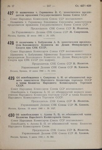 Постановление Совета Народных Комиссаров Союза ССР. Об освобождении т. Асеева Б.П. от обязанностей члена Коллегии Народного Комиссариата Связи. 5 июня 1940 г. № 965