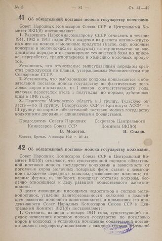 Постановление Совета Народных Комиссаров Союза ССР и Центрального Комитета ВКП(б). Об обязательной поставке молока государству колхозами. 8 января 1941 г. № 44