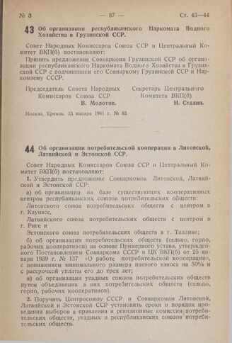 Постановление Совета Народных Комиссаров Союза ССР и Центрального Комитета ВКП(б). Об организации потребительской кооперации в Литовской, Латвийской и Эстонской ССР. 15 января 1941 г. № 99