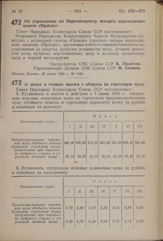 Постановление Совета Народных Комиссаров Союза ССР. О ценах и ставках налога с оборота на гороховую муку. 23 июня 1940 г. № 1089