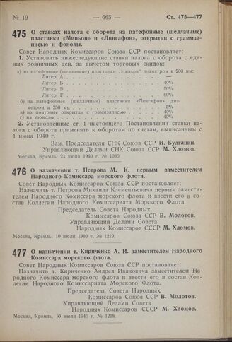 Постановление Совета Народных Комиссаров Союза ССР. О назначении т. Петрова М.К. первым заместителем Народного Комиссара морского флота. 10 июля 1940 г. № 1219