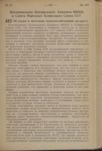 Постановление Центрального Комитета ВКП(б) и Совета Народных Комиссаров Союза ССР. Об уборке и заготовках сельскохозяйственных продуктов