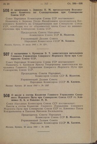 Постановление Совета Народных Комиссаров Союза ССР. О вводе в состав Коллегии Главного Управления Северного Морского Пути при Совнаркоме Союза ССР тт. Клименко П.К. и Павлова М.В. 20 июля 1940 г. № 1308