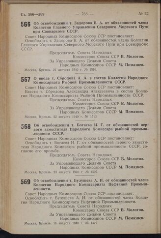 Постановление Совета Народных Комиссаров Союза ССР. О вводе т. Сбродова А.А. в состав Коллегии Народного Комиссариата Рыбной Промышленности СССР. 22 августа 1940 г. № 1513