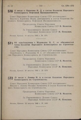 Постановление Совета Народных Комиссаров Союза ССР. О вводе т. Левина И.А. в состав Коллегии Народного Комиссариата по Строительству. 16 августа 1940 г. № 1480
