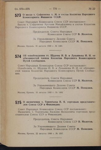 Постановление Совета Народных Комиссаров Союза ССР. О назначении т. Терентьева В.Я. торговым представителем Союза ССР в Финляндии. 22 августа 1940 г. № 1507