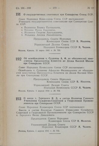 Постановление Совета Народных Комиссаров Союза ССР. Об освобождении т. Суханова А.Ф. от обязанностей заместителя Председателя Комитета по Делам Высшей Школы при Совнаркоме СССР. 1 апреля 1941 г. № 752