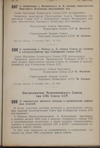 Постановление Совета Народных Комиссаров Союза ССР. О назначении т. Панова А.Д. членом Совета по топливу и электрохозяйству при Совнаркоме Союза ССР. 9 сентября 1940 г. № 1656