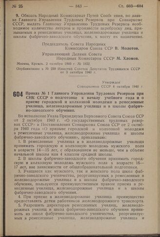 Приказ № 1 Главного Управления Трудовых Резервов при СНК СССР о подготовке к началу учебного года и о приеме городской и колхозной молодежи в ремесленные училища, железнодорожные училища и в школы фабрично-заводского обучения. Утвержден Совнаркомо...