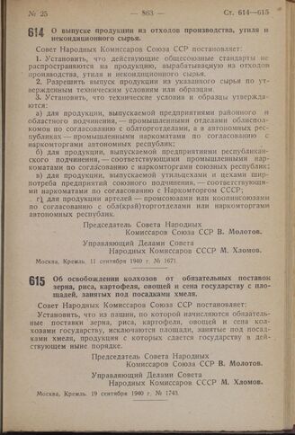 Постановление Совета Народных Комиссаров Союза ССР. О выпуске продукции из отходов производства, утиля и некондиционного сырья. 11 сентября 1940 г. № 1671
