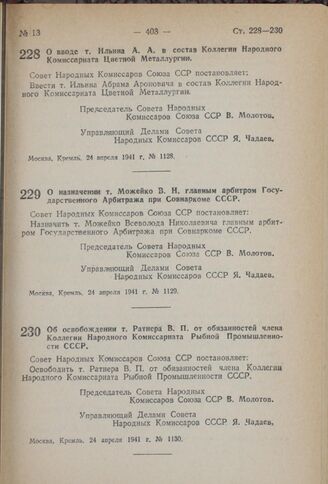 Постановление Совета Народных Комиссаров Союза ССР. О назначении т. Можейко В.Н. главным арбитром Государственного Арбитража при Совнаркоме СССР. 24 апреля 1941 г. № 1129
