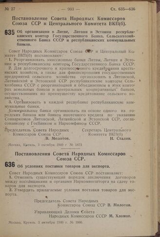 Постановление Совета Народных Комиссаров Союза ССР и Центрального Комитета ВКП(б). Об организации в Литве, Латвии и Эстонии республиканских контор Государственного Банка, Сельскохозяйственного Банка СССР и республиканских коммунальных банков. 3 ок...