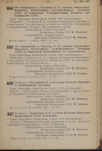 Постановление Совета Народных Комиссаров Союза ССР. О вводе т. Мартышева В.К. в состав Коллегии Народного Комиссариата Путей Сообщения. 23 сентября 1940 г № 1759