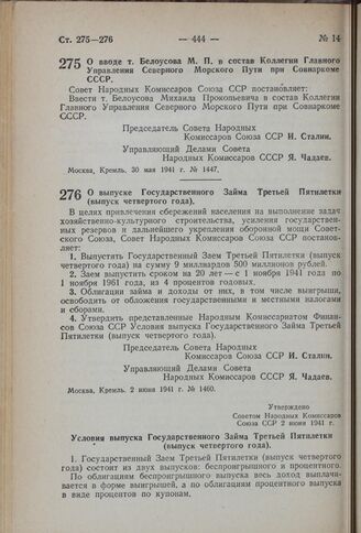 Постановление Совета Народных Комиссаров Союза ССР. О выпуске Государственной Займа Третьей Пятилетки (выпуск четвертого года). 2 июня 1941 г. № 1460