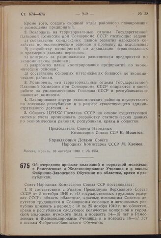 Постановление Совета Народных Комиссаров Союза ССР. Об очередном призыве колхозной и городской молодежи в Ремесленные и Железнодорожные Училища и в школы Фабрично-Заводского Обучения по областям, краям и республикам. 9 октября 1940 г. № 1941