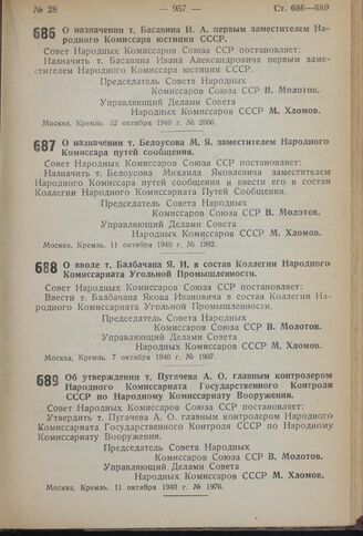 Постановление Совета Народных Комиссаров Союза ССР. О назначении т. Басавина И.А. первым заместителем Народного Комиссара юстиции СССР. 12 октября 1940 г. № 2006