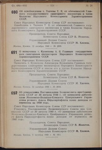Постановление Совета Народных Комиссаров Союза ССР. Об утверждении Постановления Экономсовета при Совнаркоме СССР от 30 августа 1940 г. «О занижении работниками Московско-Волжско-Камского Центрального Управления речного флота Наркомречфлота плана доходов от перевозок на 1940 год». 5 октября 1940 г. № 1911