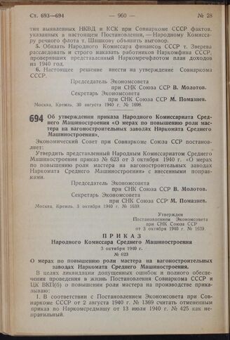 Постановление Экономического Совета при СНК Союза ССР. Об утверждении приказа Народного Комиссариата Среднего Машиностроения «О мерах по повышению роли мастера на вагоностроительных заводах Наркомата Среднего Машиностроения». 3 октября 1940 г. № 1639