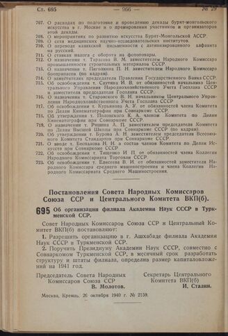 Постановления Совета Народных Комиссаров Союза ССР и Центрального Комитета ВКП(б). Об организации филиала Академии Наук СССР в Туркменской ССР. 26 октября 1940 г. № 2159