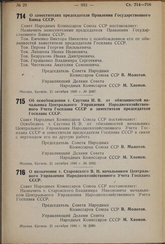 Постановление Совета Народных Комиссаров Союза ССР. О заместителях председателя Правления Государственного Банка СССР. 21 октября 1940 г. № 2037