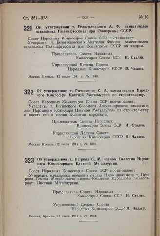 Постановление Совета Народных Комиссаров Союза ССР. Об утверждении т. Рогинского С.А. заместителем Народного Комиссара Цветной Металлургии по строительству. 12 июля 1941 г. № 1849
