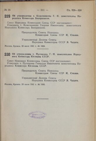 Постановление Совета Народных Комиссаров Союза ССР. Об утверждении т. Пуговкина Г.Н. заместителем Народного Комиссара Юстиции СССР. 20 июля 1941 г. № 1886