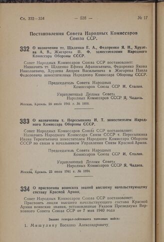 Постановление Совета Народных Комиссаров Союза ССР. О назначении т. Пересыпкина И.Т. заместителем Народного Комиссара Обороны СССР. 23 июля 1941 г. № 1894