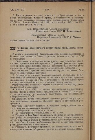 Постановление Совета Народных Комиссаров Союза ССР. О фондах долгосрочного кредитования промысловой кооперации. 29 июля 1941 г. № 1904