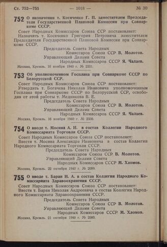Постановление Совета Народных Комиссаров Союза ССР. О вводе т. Мосина А.И. в состав Коллегии Народного Комиссариата Торговли СССР. 22 октября 1940 г. № 2099