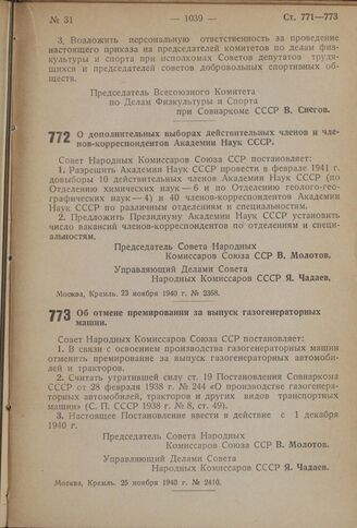 Постановление Совета Народных Комиссаров Союза ССР. О дополнительных выборах действительных членов и членов-корреспондентов Академии Наук СССР. 23 ноября 1940 г. № 2368