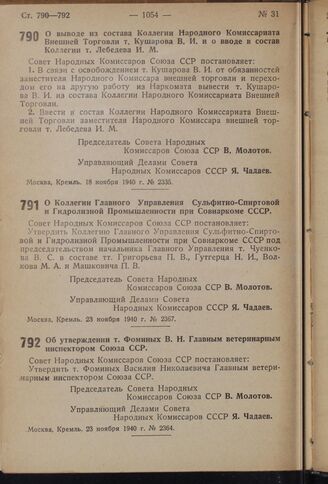 Постановление Совета Народных Комиссаров Союза ССР. О выводе из состава Коллегии Народного Комиссариата Внешней Торговли т. Кушарова В.И. и о вводе в состав Коллегии т. Лебедева И.М. 18 ноября 1940 г. № 2335