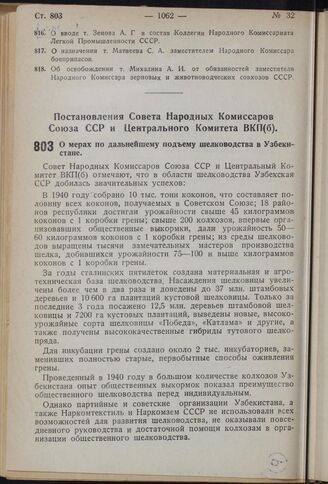 Постановление Совета Народных Комиссаров Союза ССР и Центрального Комитета ВКП(б). О мерах по дальнейшему подъему шелководства в Узбекистане. 10 декабря 1940 г. № 2498