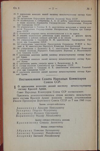 Постановление Совета Народных Комиссаров Союза ССР. О присвоении воинских званий высшему начальствующему составу Красной Армии. 20 декабря 1942 г. № 1988
